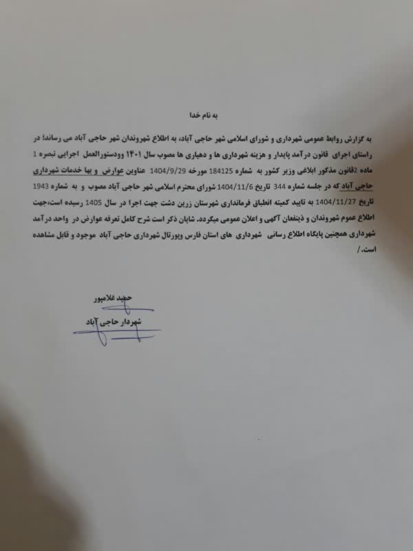 به گزارش روابط عمومی شهرداری و شورای اسلامی شهر حاجی آباد، به اطلاع شهروندان شهر حاجی آباد می رساند؛ در راستای اجرای قانون درآمد پایدار و هزینه شهرداری ها و دهیاری ها مصوب سال ۱۴۰۱ و دستورالعمل اجرایی تبصره ۱ ماده ۲ قانون مذکور ابلاغی وزیر کشور به شماره ۱۸۴۱۲۵ مورخه ۲۹/۹/۱۴۰۴ عناوین عوارض و بهاء خدمات شهرداری حاجی آباد که در جلسه شماره ۳۴۴ تاریخ ۶/۱۱/۱۴۰۴ شورای محترم اسلامی شهر حاجی آباد مصوب و به شماره ۱۹۴۳ تاریخ ۲۷/۱۱/۱۴۰۴ به تایید کمیته انطباق فرمانداری شهرستان زرین دشت، جهت اجرا در سال ۱۴۰۵ رسیده است، جهت اطلاع عموم شهروندان و ذینفعان آگهی و اعلان عمومی می گردد. شایان ذکر است شرح کامل تعرفه عوارض در واحد درآمد شهرداری، همچنین پایگاه اطلاع رسانی شهرداری های استان فارس و پورتال شهرداری حاجی آباد موجود و قابل مشاهده است./