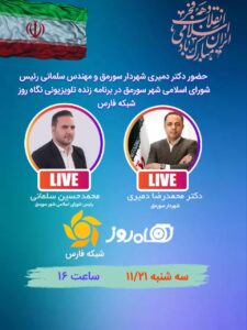 حضور دکتر دمیری شهردار سورمق و مهندس سلمانی رئیس شورای اسلامی شهر سورمق در برنامه زنده تلویزیونی نگاه روز. شبکه فارس