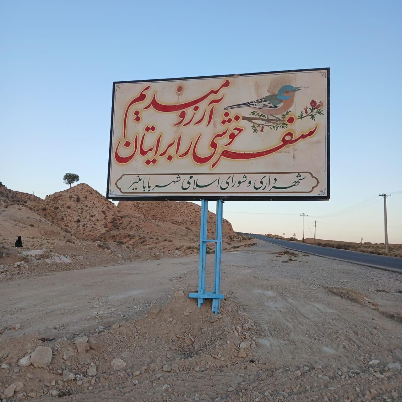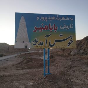 طی مصاحبه ای با شهردار این شهر جناب آقای مهندس طاهری ایشان افزودند که به جهت هویت بخشیدن به شهر اقدام به تهیه المان فارسی بابامنیرو تابلو خوش آمد گویی نمودم تا پس از سالها گذر از شهر شدن ،شهروندان حس شهر بودن را تجربه کنند.